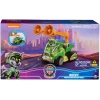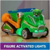 Dressed in his green PAW Patrol: The Mighty Movie uniform, with translucent sections and a cool helmet, clip Rocky onto the seat of his rescue trash truck to activate the illumination in multiple areas of the vehicle, and watch his paws light up, to make for even more exciting, super-charged, rescues as you roll his rescue vehicle from one mission to another!